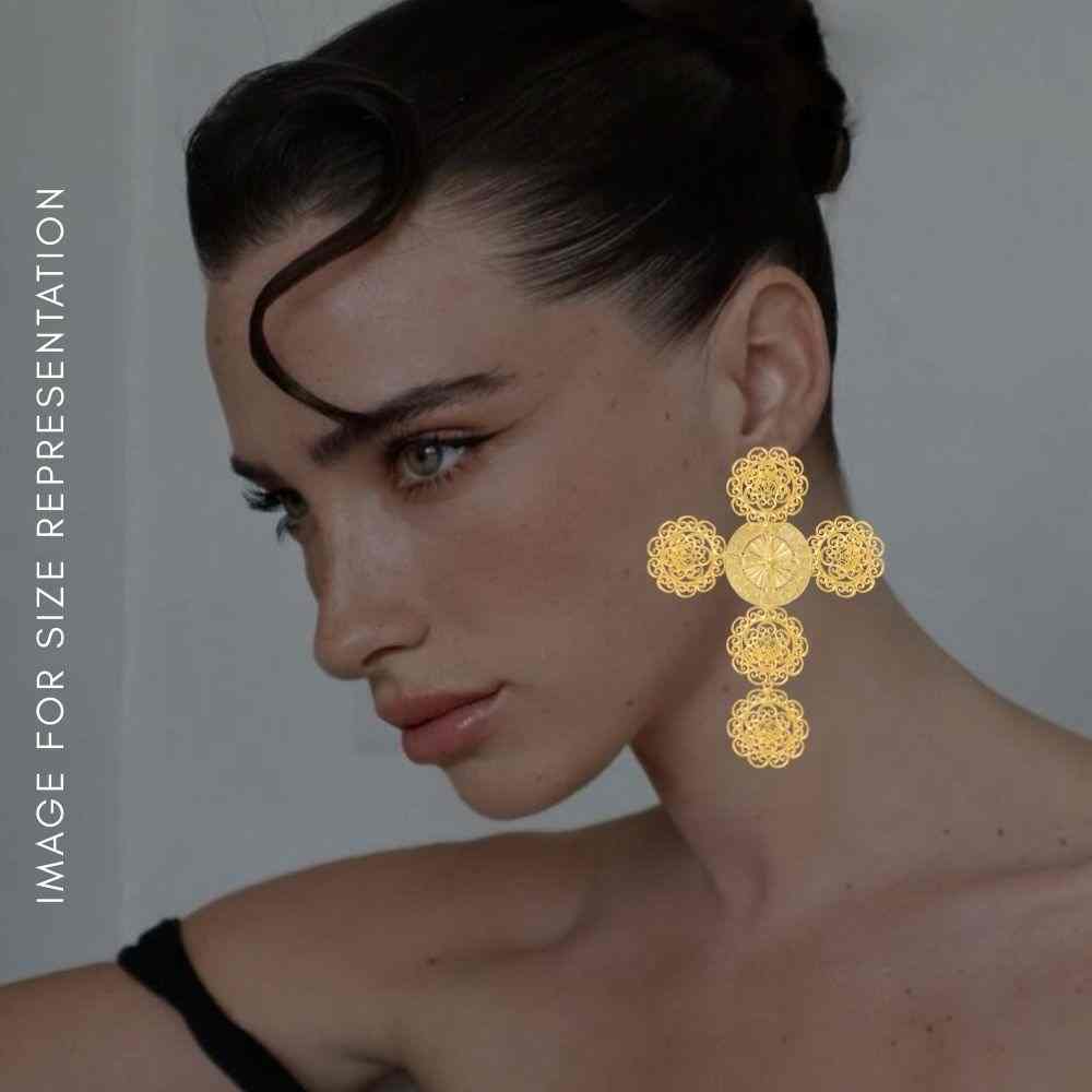 Discover the exquisite beauty of our delicately handcrafted Cross Earrings. These unique pieces showcase very delicate and intricate filigree work, a testament to traditional handcraftsmanship. The meticulous artistry makes them feel incredibly lightweight – you might even forget you're wearing them! The central element features a compass-like motif, symbolizing finding direction in life, intricately detailed with zodiac signs. Featuring a modernised cross silhouette, the design is deeply rooted in traditional filigree handwork, with subtle hints drawn from Victorian architecture. This fusion creates a truly unique and captivating aesthetic. Effortlessly versatile, these earrings can be styled up or down with ease. Pair them with casual everyday wear for a touch of understated elegance, or let them add a sophisticated sparkle to your evening attire. Their timeless design makes them a breeze to incorporate into any look, carrying a meaningful and stylish message. (gold earrings, cross earrings, filigree earrings, intricate earrings, lightweight earrings, modern traditional, Victorian inspired, versatile earrings, compass motif, zodiac jewelry, designer earrings)