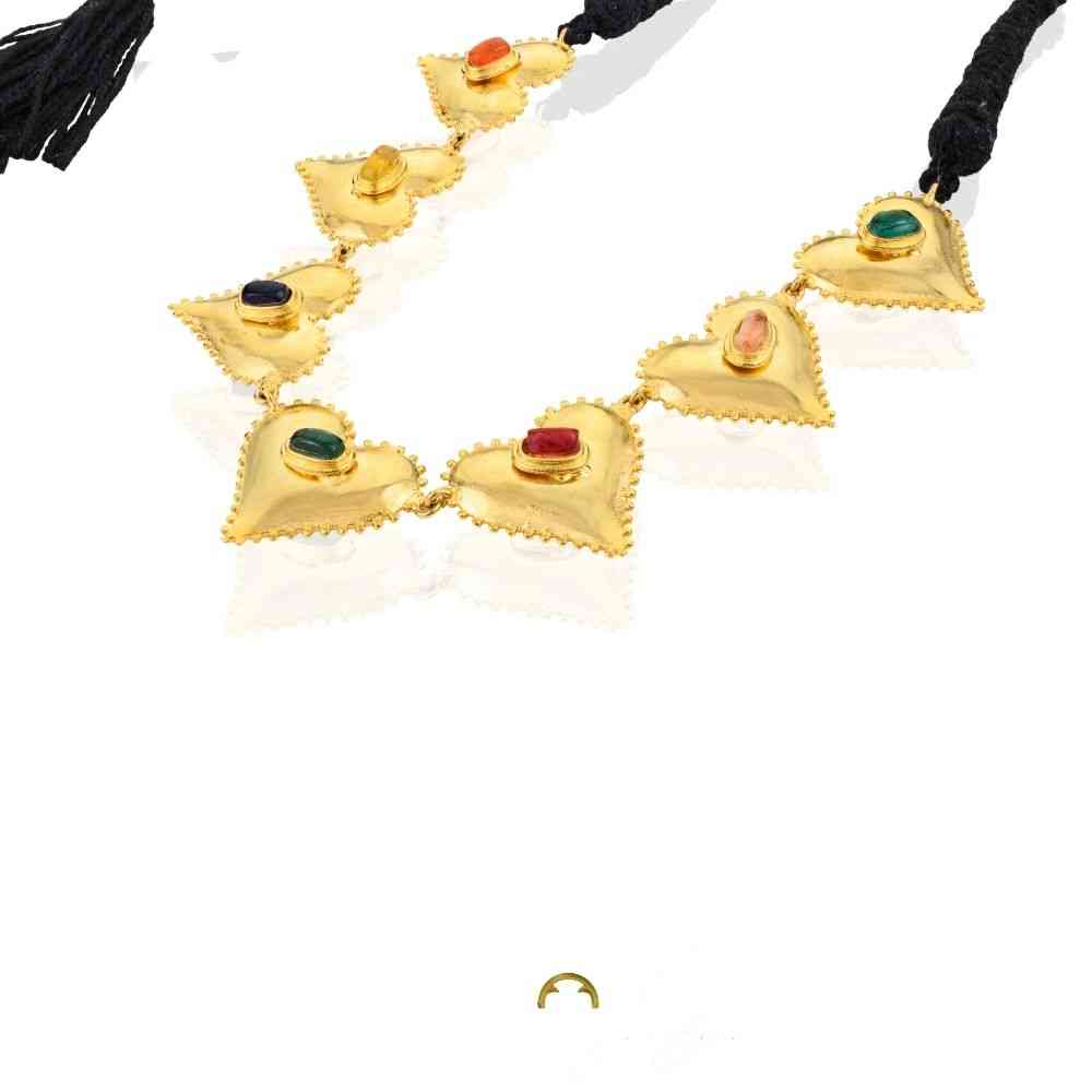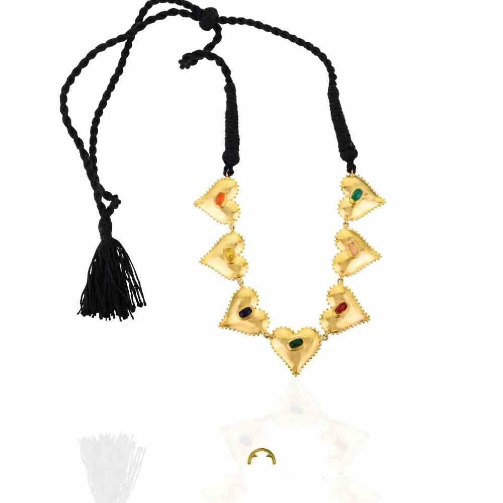 Dilbagh Necklace beautifully marries tradition and modernity. Multiple sharp heart motifs, echoing a contemporary aesthetic yet rooted in classic Indian design, are seamlessly linked together. The necklace is finished with a traditional black dori closure, adding an authentic touch and adjustable versatility.
