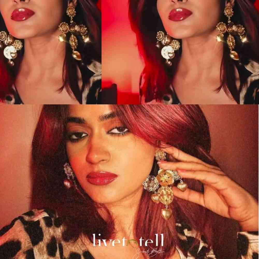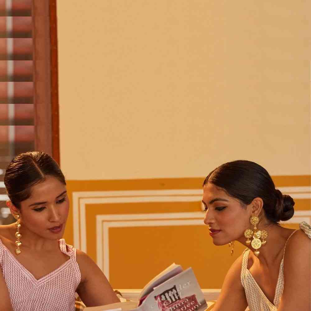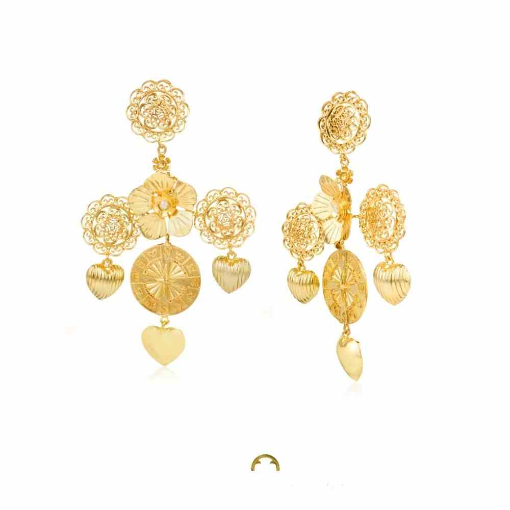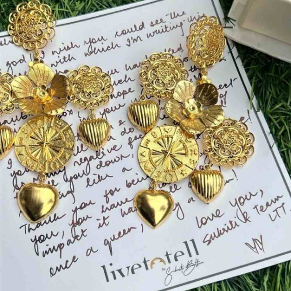 True to their name, "Rani Baug" (Queen's Garden), these earrings are designed to make you feel like Royalty. Born to Steal the Spotlight, Sangeet nights or after-parties, these beauties demand attention. Gleaming 18k gold plating and a striking cross silhouette intricate details make a dazzling entrance, wherever you go. Intricately handcrafted with delicate filigree motifs, a central floral element along with a meaningful Zodiac-Directional motif add a unique touch, while playful striped hearts delicately dangle, adding a dash of daintiness to this otherwise bold silhouette. Despite their opulent and heavy appearance, these shoulder dusters are surprisingly lightweight, a testament to their unique handcrafting. Be prepared to stand out, turn heads, and receive a cascade of compliments with these uniquely traditional yet modern earrings. How to Style? Let these exquisite earrings be the focal point of your look. Pair them with elegant evening wear to amplify their dramatic flair, or add a touch of bold glamour to simpler outfits. Their intricate beauty ensures they will always make a memorable statement, fit for a queen. (shoulder dusters, statement earrings, cross earrings, filigree earrings, floral earrings, heart earrings, lightweight earrings, unique earrings, handcrafted jewelry, designer earrings, queen jewelry)
